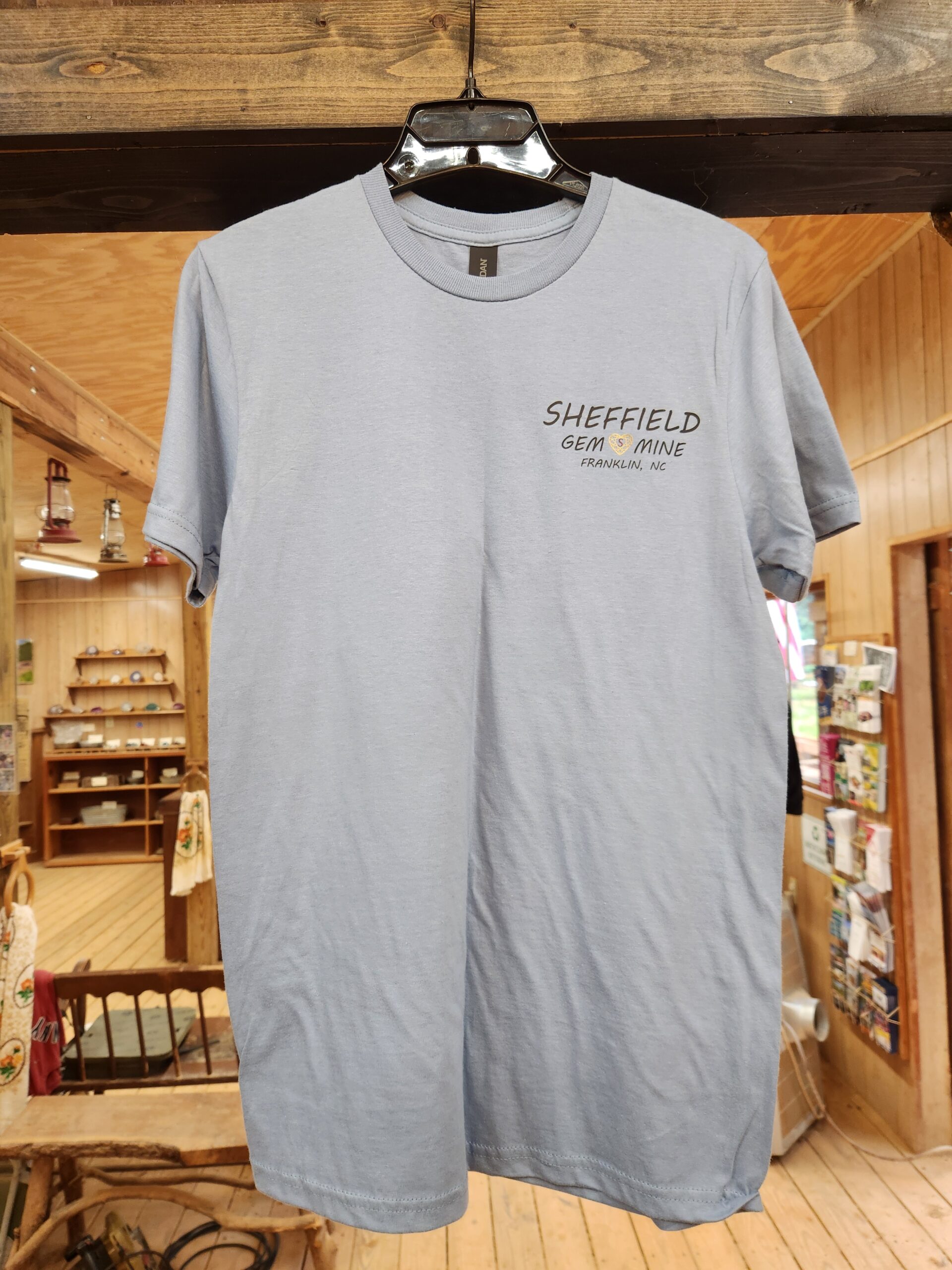 Retro Bear Gem Mining on the Flume on a light blue T-Shirt on back. Front displays the Sheffield brand.